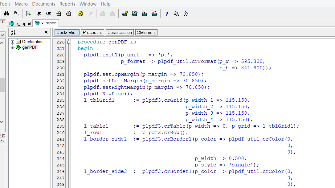 Processing the DOCX template is the parsing the DOCX structure and creating PL/PDF conform PL/SQL package body for the Data Model header. Result is a full PDF Generator PL/SQL code, optimized for every day using.