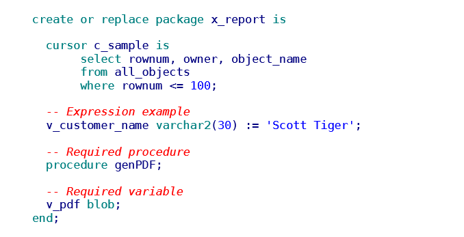 PL/PDF Reporting Data Model is a simple solution to implement the report related data sources and variables. The user creates the report data model manually as the report package header and PL/PDF Report Processor creates the report runtime as the package body. Typically the Data Model contains PL/SQL cursor definitions and GROUP control references in the template.