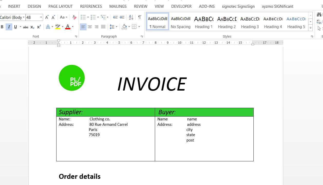 Switching on the Design mode in MS Word and use Content Control items as placeholders for dynamic text and images and PL/SQL codes. The Design mode switched off state does not contain the Control items and layout is 100% equal with original content. When you switched on the Design Mode again then you can easily select and modify existing Controls.